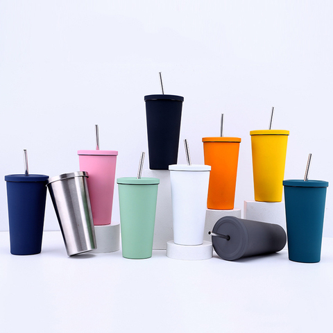 Sıcak 500ml taşınabilir renkli Logo isteğe bağlı kapaklar paslanmaz çelik yalıtımlı özel kahve kapaklı bardak ve saman